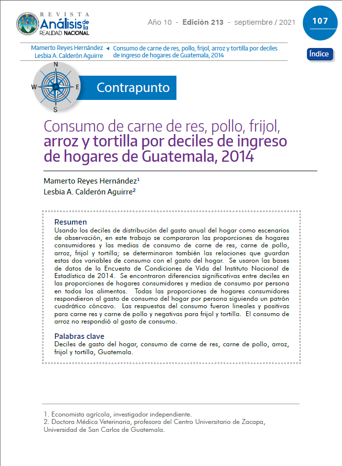 Consumo de carne de res, pollo, frijol, arroz y tortilla por deciles de ingreso de hogares de Guatemala, 2014. (2025). Análisis De La Realidad Nacional, 10(213), 107-137. https://revistasguatemala.usac.edu.gt/IPNUSAC/article/view/2660