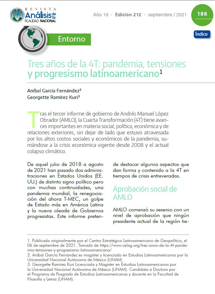 Tres años de la 4T: pandemia, tensiones y progresismo latinoamericano. (2025). Análisis De La Realidad Nacional, 10(212), 186-194. https://revistasguatemala.usac.edu.gt/IPNUSAC/article/view/2691
