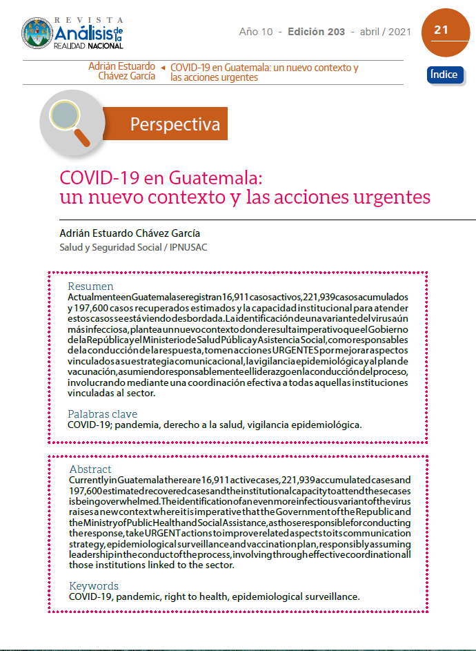 ActualmenteenGuatemalaseregistran16,911casosactivos, 221,939casosacumulados y 197,600 casos recuperados estimados y la capacidad institucional para atender estos casos se está viendo desbordada. La identificación de una variante del virus aún más infecciosa, plantea un nuevo contexto donde resulta imperativo que el Gobierno de la República y el Ministerio de Salud Pública y Asistencia Social, como responsables de la conducción de la respuesta, tomen acciones URGENTES por mejorar aspectos vinculados a su estrategia comunicacional, la vigilancia epidemiológica y al plan de vacunación, asumiendo responsablemente el liderazgo en la conducción del proceso, involucrando mediante una coordinación efectiva a todas aquellas instituciones vinculadas al sector.