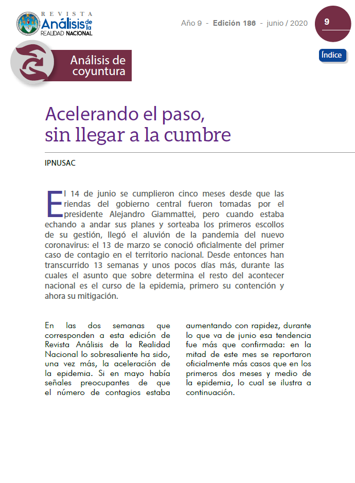El 14 de junio se cumplieron cinco meses desde que las riendas del gobierno central fueron tomadas por el presidente Alejandro Giammattei, pero cuando estaba echando a andar sus planes y sorteaba los primeros escollos de su gestión, llegó el aluvión de la pandemia del nuevo coronavirus: el 13 de marzo se conoció oficialmente del primer caso de contagio en el territorio nacional. Desde entonces han transcurrido 13 semanas y unos pocos días más, durante las cuales el asunto que sobre determina el resto del acontecer nacional es el curso de la epidemia, primero su contención y ahora su mitigación.
