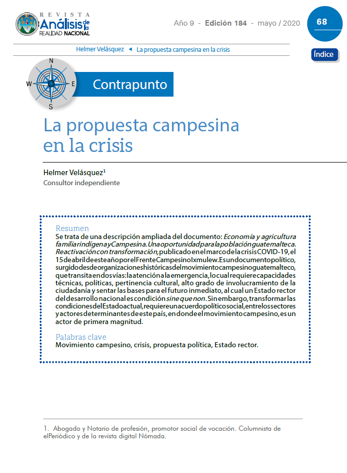 Se trata de una descripción ampliada del documento: Economía y agricultura familiar indígena y Campesina. Una oportunidad para la población guatemalteca. Reactivación con transformación, publicado en el marco de la crisis COVID-19, el 15 de abril de este año por el Frente Campesino Ixmulew. Es un documento político, surgido desde organizaciones históricas del movimiento campesino guatemalteco, que transita en dos vías: la atención a la emergencia, lo cual requiere capacidades técnicas, políticas, pertinencia cultural, alto grado de involucramiento de la ciudadanía y sentar las bases para el futuro inmediato, al cual un Estado rector del desarrollo nacional es condición sine que non. Sin embargo, transformar las condiciones del Estado actual, requiere un acuerdo político social, entre los sectores y actores determinantes de este país, en donde el movimiento campesino, es un actor de primera magnitud.
