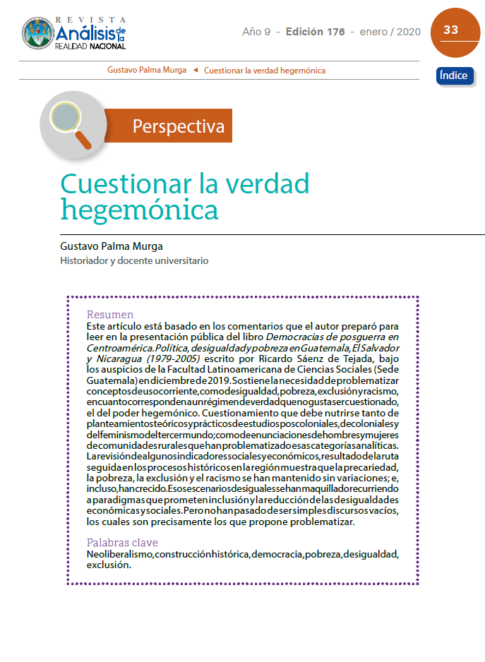 Este artículo está basado en los comentarios que el autor preparó para leer en la presentación pública del libro Democracias de posguerra en Centroamérica. Política, desigualdad y pobreza en Guatemala, El Salvador y Nicaragua (1979-2005) escrito por Ricardo Sáenz de Tejada, bajo los auspicios de la Facultad Latinoamericana de Ciencias Sociales (Sede Guatemala) en diciembre de 2019. Sostiene la necesidad de problematizar conceptos de uso corriente, como desigualdad, pobreza, exclusión y racismo, en cuanto corresponden a un régimen de verdad que no gusta ser cuestionado, el del poder hegemónico. Cuestionamiento que debe nutrirse tanto de planteamientos teóricos y prácticos de estudios poscoloniales, decoloniales y de feminismo del tercer mundo; como de enunciaciones de hombres y mujeres de comunidades rurales que han problematizado esas categorías analíticas. La revisión de algunos indicadores sociales y económicos, resultado de la ruta seguida en los procesos históricos en la región muestra que la precariedad, la pobreza, la exclusión y el racismo se han mantenido sin variaciones; e, incluso, han crecido. Esos escenarios desiguales se han maquillado recurriendo a paradigmas que prometen inclusión y la reducción de las desigualdades económicas y sociales. Pero no han pasado de ser simples discursos vacíos, los cuales son precisamente los que propone problematizar.