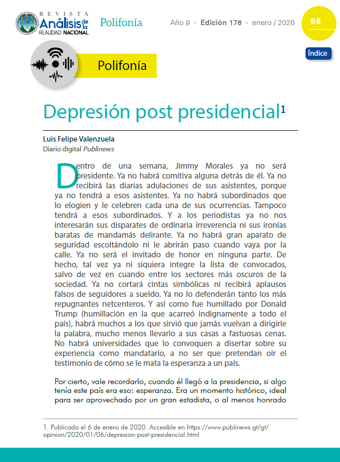 Dentro de una semana, Jimmy Morales ya no será presidente. Ya no habrá comitiva alguna detrás de él. Ya no recibirá las diarias adulaciones de sus asistentes, porque ya no tendrá a esos asistentes. Ya no habrá subordinados que lo elogien y le celebren cada una de sus ocurrencias. Tampoco tendrá a esos subordinados. Y a los periodistas ya no nos interesarán sus disparates de ordinaria irreverencia ni sus ironías baratas de mandamás delirante. Ya no habrá gran aparato de seguridad escoltándolo ni le abrirán paso cuando vaya por la calle. Ya no será el invitado de honor en ninguna parte. De hecho, tal vez ya ni siquiera integre la lista de convocados, salvo de vez en cuando entre los sectores más oscuros de la sociedad. Ya no cortará cintas simbólicas ni recibirá aplausos