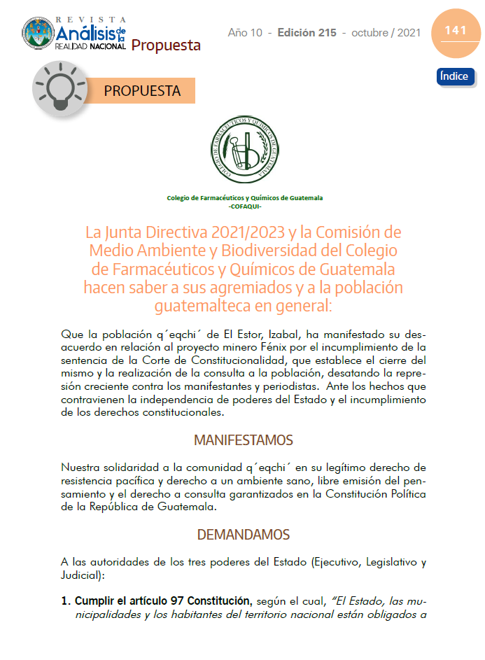 La Junta Directiva 2021/2023 y la Comisión de Medio Ambiente y Biodiversidad del Colegio de Farmacéuticos y Químicos de Guatemala hacen saber a sus agremiados y a la población guatemalteca en general