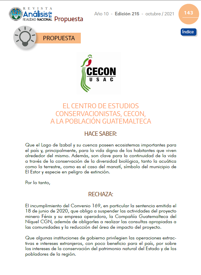 La Junta Directiva de la Facultad de Ciencias Químicas y Farmacia de la Universidad de San Carlos de Guatemala y el Centro de Estudios Conservacionistas (CECON) de la Universidad de San Carlos de Guatemala, relacionado a la actividad minera en El Estor